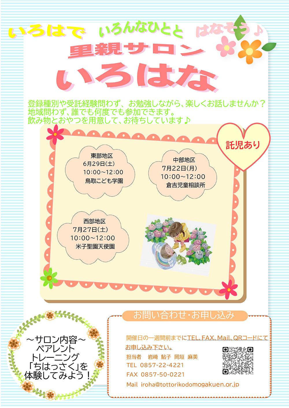 わたしたち「いろは」は、鳥取県に設置された里親支援センターです。里親・里親制度を広く知ってもらうための活動、里親になりたい方のリクルートや研修、こどもと里親が出会い、里親家庭としての暮らしを始める準備の伴走、里親養育中の家庭へのサポートといった一貫した支援を使命としています。